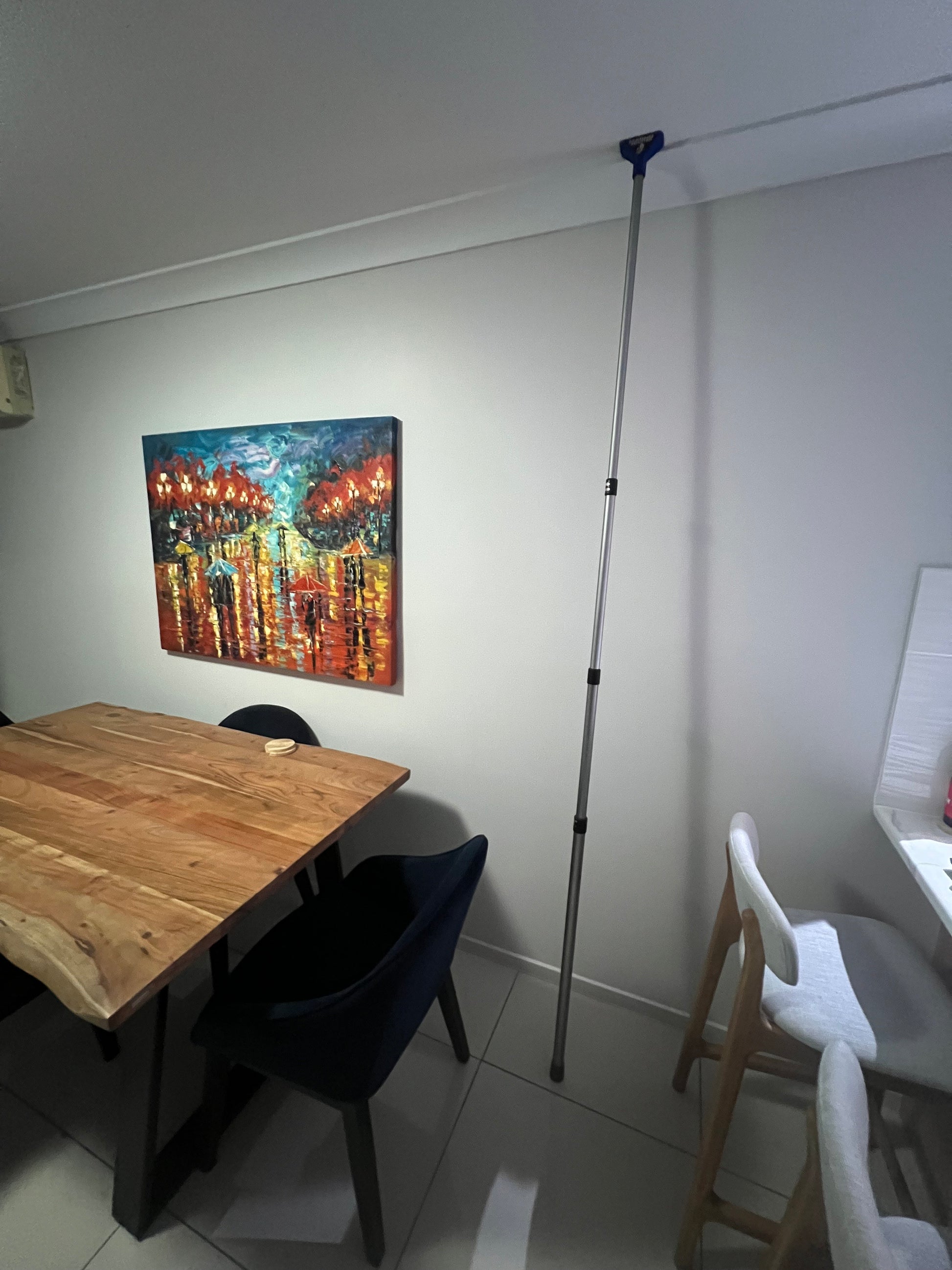 Locate the wall cavity with your stud finder. Where the location of the wall plate needs to be, place the Magno Adapter directly in front. Using the telescopic pole, place the adapter against the cornice and ceiling. Be sure it is a tight fit. Taking a Stud Finder magnet, enter the ceiling cavity and go to the location where you might think the adapter is. Rub the magnet on the plaster to locate the adapter. Once you locate it drill through top nog directly opposite magnet ( middle nog if there is one ). Drop yellow tongue. Go back to where the pole is…. BE SURE TO MARK THE WALL BEFORE REMOVING THE POLE. Cut your square and you’ll be smack on your yellow tongue every time.