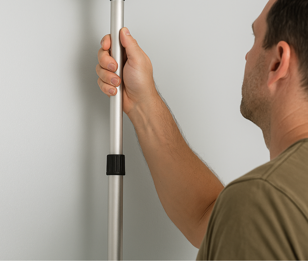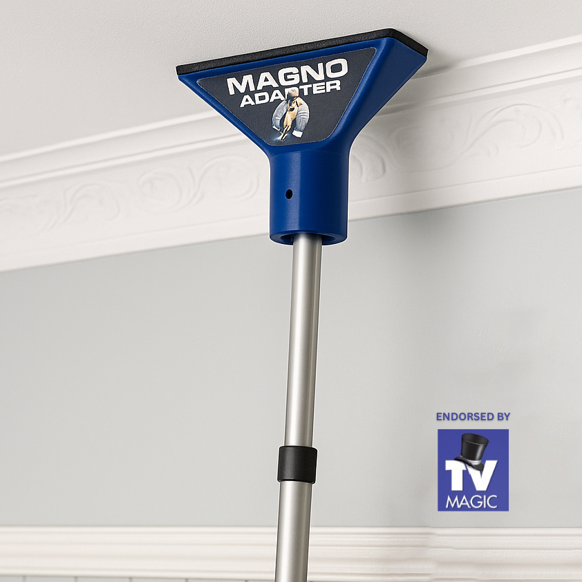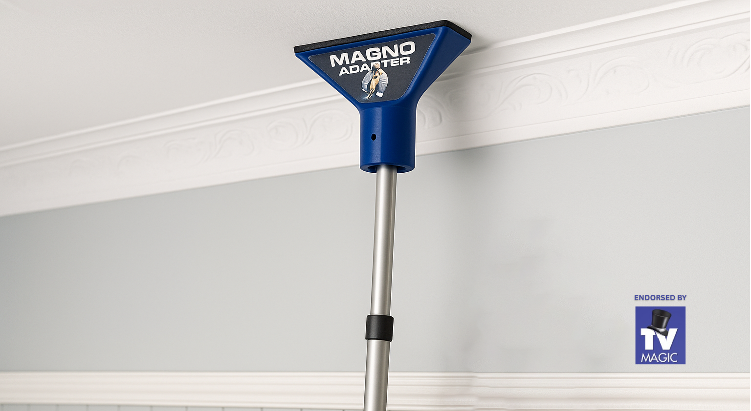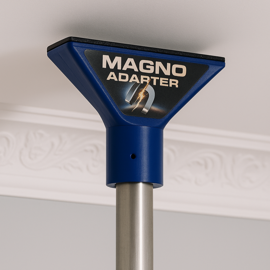 The Magno Adapter attaches to a telescopic pole and is used in combination with a stud finder magnet from above. Once aligned, it gives you the exact position for your wall plate cutout — eliminating guesswork and reducing installation time.